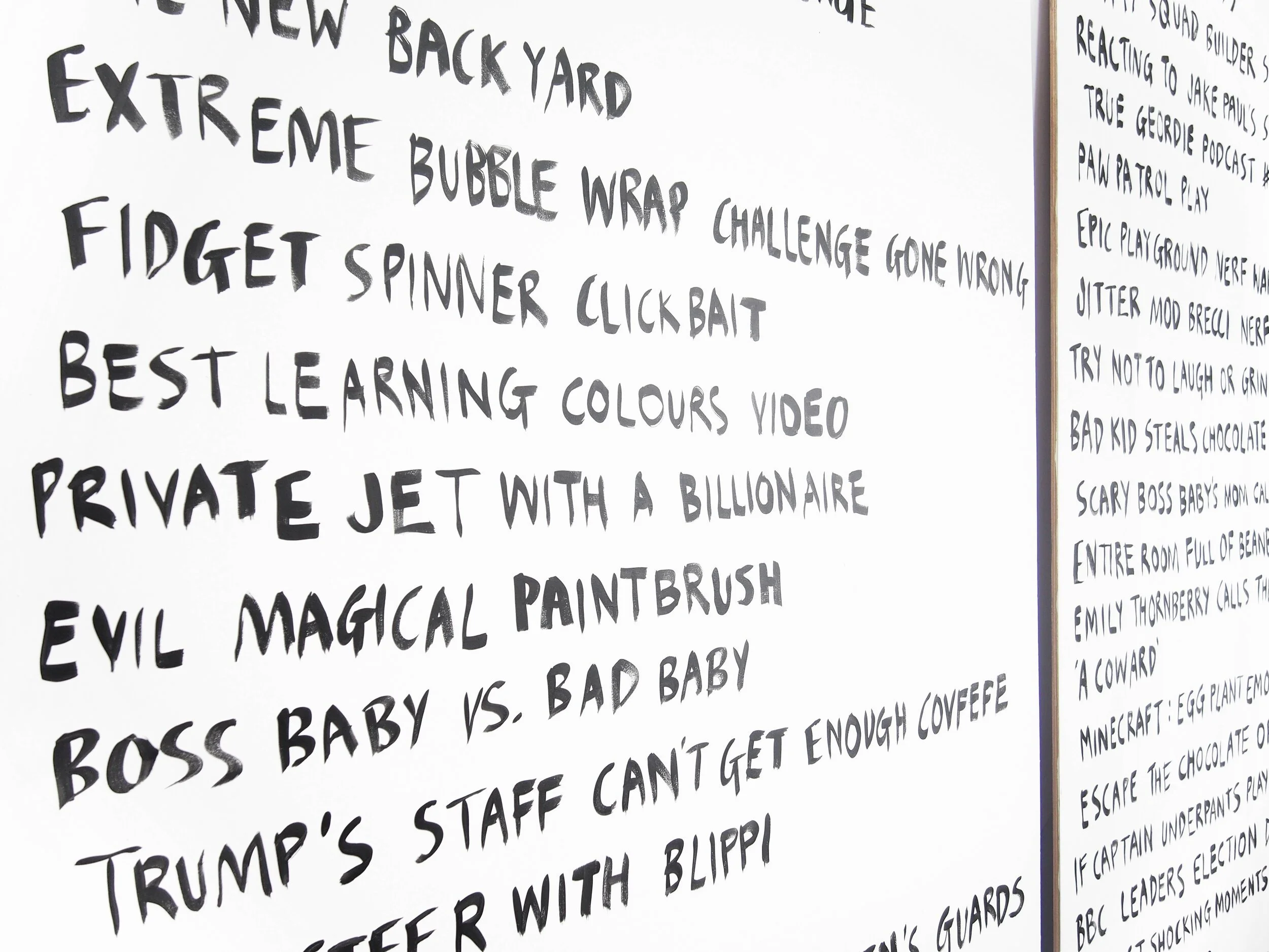 Newsfeed is a text-based work compiled from a data list of the most popular YouTube videos in the UK on 1st June 2017. The list is an alternative narrative of a particular time and place. Out of context, the list reads like a series of newspaper headlines. It reveals obsessions for fidget toys and minecraft, alongside more timeless interests like politics and the Royal Family. The production date was scheduled as 1st June 2017, exactly one week before the UK general election, two months after the beginning of the Brexit process and 6 months after Donald Trump became President of the United States. The work explores the idea of simultaneously acting as a newsfeed and as an archival document.
